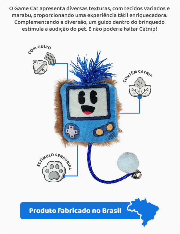 Game Cat é um brinquedo de pelúcia com guizo, Catnip e marabu que vai promover mais diversão e enriquecimento ambiental à rotina do seu gato.