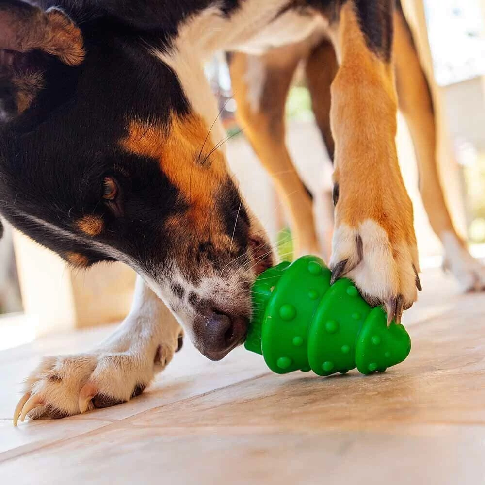 Natalina é um brinquedo recheável, em formato de árvore de Natal, que estimula seu pet a se alimentar enquanto se diverte.