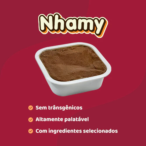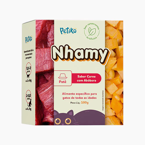 A Ração Úmida Patê Nhamy sabor Carne com Abóbora foi criada para oferecer uma refeição irresistível, nutritiva e natural para gatos de todas as idades. Com textura cremosa e sabor marcante, é ideal para agradar até os felinos mais exigentes, servindo como complemento à alimentação diária ou como um mimo especial. Desenvolvida por especialistas em nutrição felina, que combina ingredientes selecionados — como carne, fígado e abóbora — com conservantes naturais e zero transgênicos. Uma opção saudável, prática e cheia de sabor para reforçar o carinho no dia a dia do seu gato.