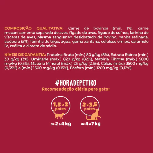 Carne de bovinos (mín. 1%), carne mecanicamente separada de aves, fígado de aves, fígado de suínos, farinha de vísceras de aves, plasma sanguíneo desidratado de bovino, banha refinada, abóbora (5%), farinha de trigo, água, goma xantana, celulose em pó, caramelo IV, zeolita e cloreto de sódio.