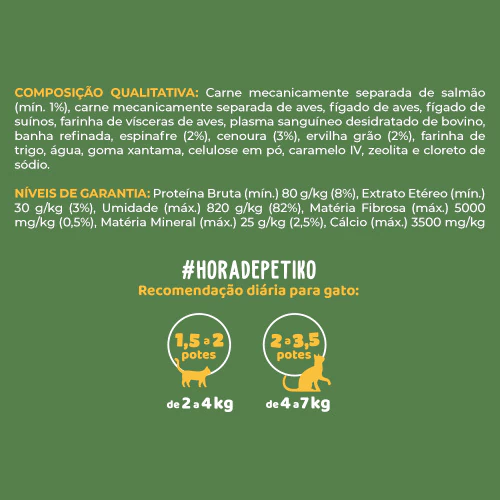 Ingredientes: Carne mecanicamente separada de salmão, carne mecanicamente separada de aves, fígado de aves e suínos, farinha de vísceras de aves, plasma sanguíneo bovino, banha refinada, espinafre, cenoura, ervilha, farinha de trigo, água, goma xantana, celulose em pó, caramelo IV, zeolita e sal.
